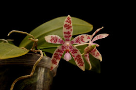 Phalaenopsis hieroglyphica 'Dark'. Kaks õit on juba lahti, kolmas alles pungana.